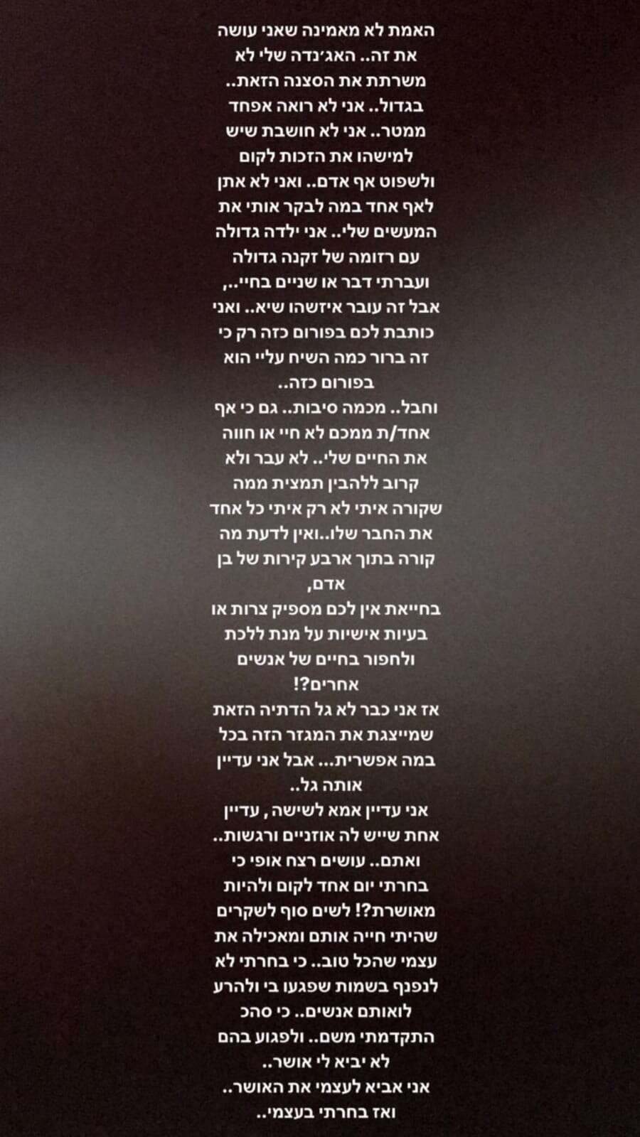 "בחרתי בוקר אחד להפסיק לתת אוכל לאנשים שיאשרו אותי, להפסיק לרצות את העולם ולהתחיל לרצות את עצמי. לאהוב את עצמי בכנות, לחיות את האמת שלי, לבחור באושר שלי גם אם זה יעלה לי במחיר של ריכולים ועלבונות. גם אם זה בקושי של התמודדות יום יומית עם מצבים שאת לא מתארת שיפלו עלייך שאנשים שמים לך רגליים ומנסים ליישר אותך כי בעיניהם את יוצאת מהמסלול. מי קבע מה המסלול הנכון? יש רק דרך אחת לחיות? בשלב הזה של החיים שלי השכלתי להבין כמה האנשים שמולך הם לא מה שאתם רואים בפרונט. כמה קל להחריב הרים עם הלשון, לפגוע להתסיס לפרק עולמות. תשקלו מילים. תנסו לשים את עצמכם בנעליים של אחרים ואם אין לכם את היכולות פשוט תרפו ואל תשימו את היד שלכם בגורל של אחרים. תחשבו צעד קדימה. סוף מעשה במחשבה תחילה. בי יותר לא יזלזלו. אותי לא ישפילו. אותי יעריכו", כתבה בנחרצות.