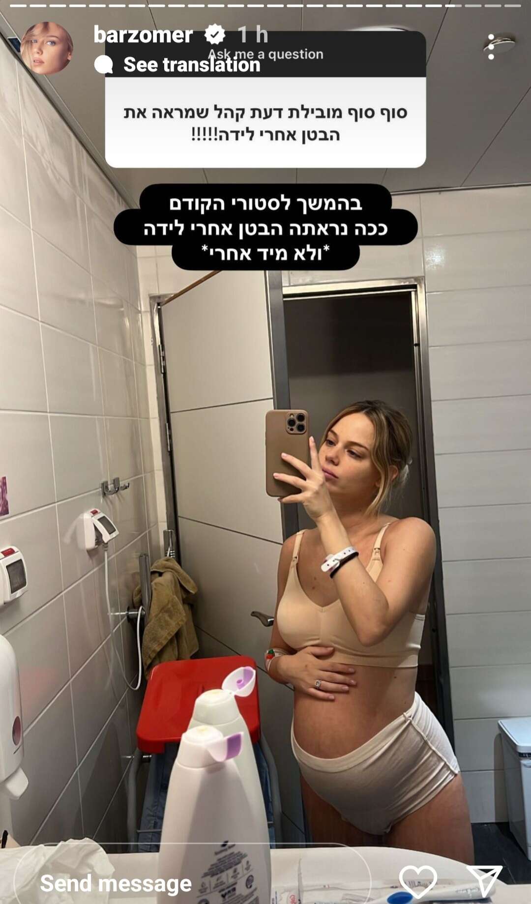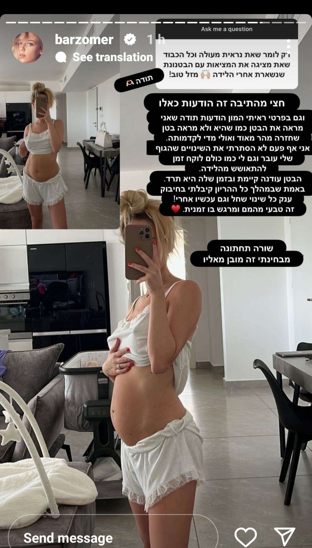 "רק לומר שאת נראית מעולה, וכל הכבוד שאת מציגה את המציאות עם הבטנונת שנשארת אחרי הלידה, מזל טוב!", כתבה לה עוקבת מפרגנת. בתגובה לכך, הדוגמנית ואשת העסקים הציגה שתי תמונות שלה לאחר הלידה. "ראיתי המון הודעות תודה על כך שאני מראה את הבטן כפי שהיא, ולא מראה בטן שחזרה מהר מאוד, אולי מהר מדי, לקדמותה", כתבה, והבהירה: "אף פעם לא הסתרתי את השינויים שהגוף שלי עובר, וגם לי, כמו לכולן, לוקח זמן להתאושש מהלידה. הבטן עודנה קיימת ובזמן שלה היא תרד. באמת שבמהלך כל ההיריון קיבלתי בחיבוק ענק כל שינוי שחל, וגם אחרי. זה טבעי, מהמם ומרגש בו-זמנית. מבחינתי זה מובן מאליו".