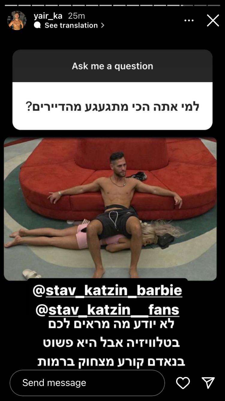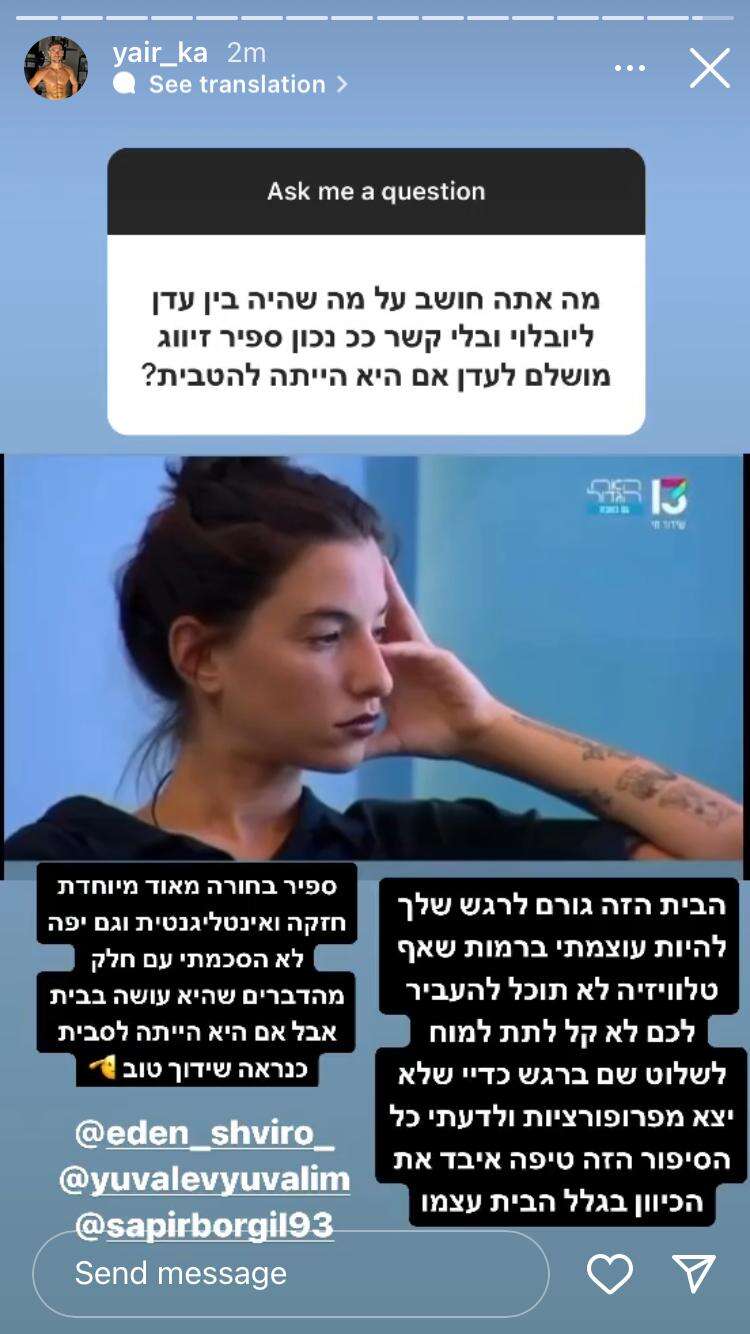 "מה את חושב על מה שליאל עושה לסתיו, אתה חושב שהוא יגיע לגמר?", ביקשו מיאיר להביע את דעתו בעניין. "בהתחלה מאוד התחברתי אליו, והרגשתי שנהפוך לחברים קרובים. אבל אחרי כמה ימים הרגיש לי לא אותנטי ואגרסיבי מדי. הניסיון לריב חזק עם סתיו בכל אפשרות ושזו המטרה העיקרית שלו בבית. פחות חושב שזה יביא אותו לגמר".