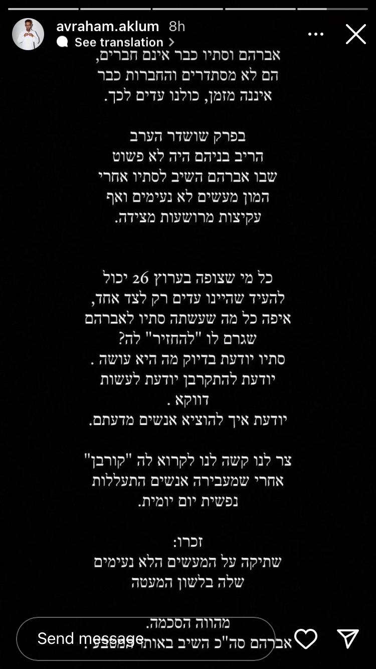 המשפחה של אברהם אקלום מבינה היטב שהגיע רגע האמת ומחממת מנועים לקראת הגמר הגדול של "האח הגדול" שיערך בעוד שבועיים בדיוק ובו יוכרז המנצח של העונה שיגרוף לכיסו מיליון שקלים. אמש (שבת) אחרי שידור הפרק שבו הודחה עדן שבירו, העלו מקורביו של אקלום סטורי שבו הביעו את דעתם על הסצנות הלא פשוטות לצפייה שבהן תועד אברהם מציק לסתיו קצין בכמה הזדמנויות, כשבשיא ההטרלה הוא נעזר בשואב אבק על מנת להטריד את מנוחתה. "כל מי שצופה בערוץ 26 יכול להעיד שהיינו עדים רק לצד אחד", תקפו את "האח הגדול".