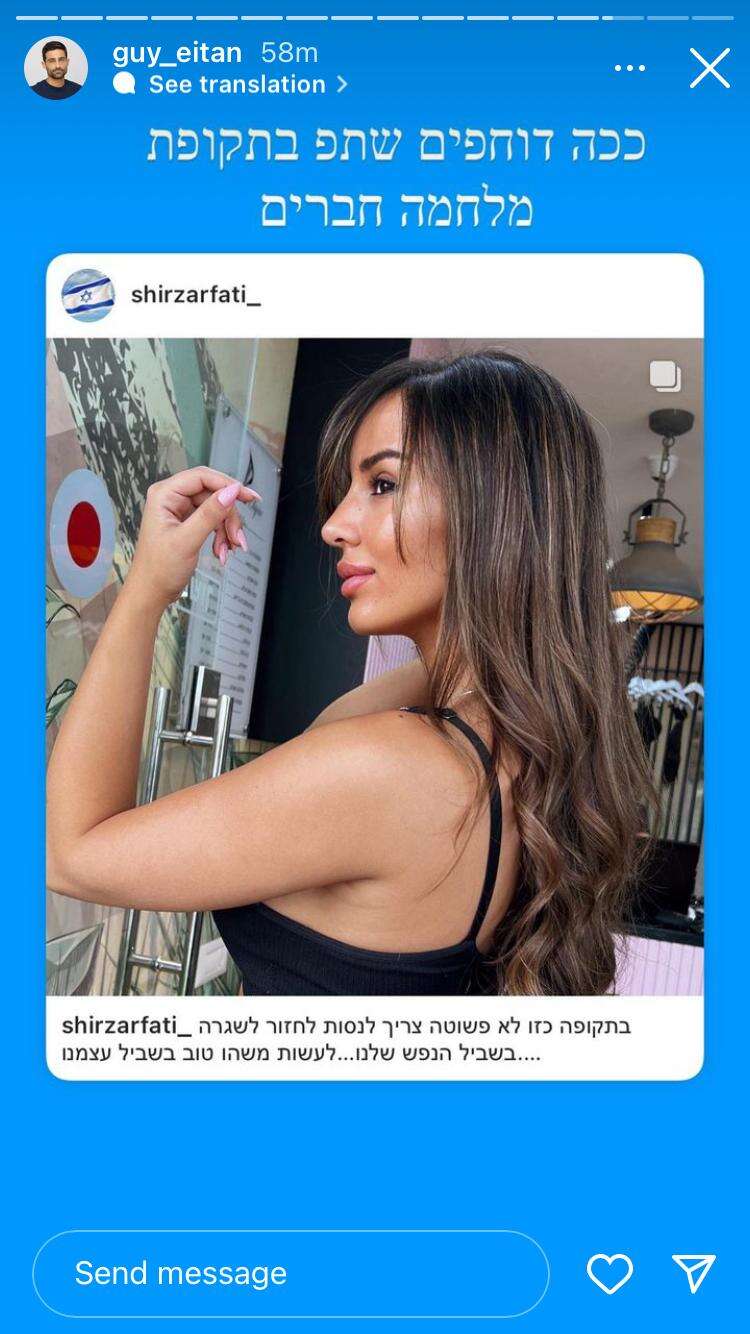 מי שבחר להתייחס לפוסט של צרפתי, היה הדייר גיא איתן שחלק איתה את קורת גג בזמן שהותם בבית "האח הגדול". "ככה דוחפים שיתוף פעולה בתקופת מלחמה, חברים", עקץ.