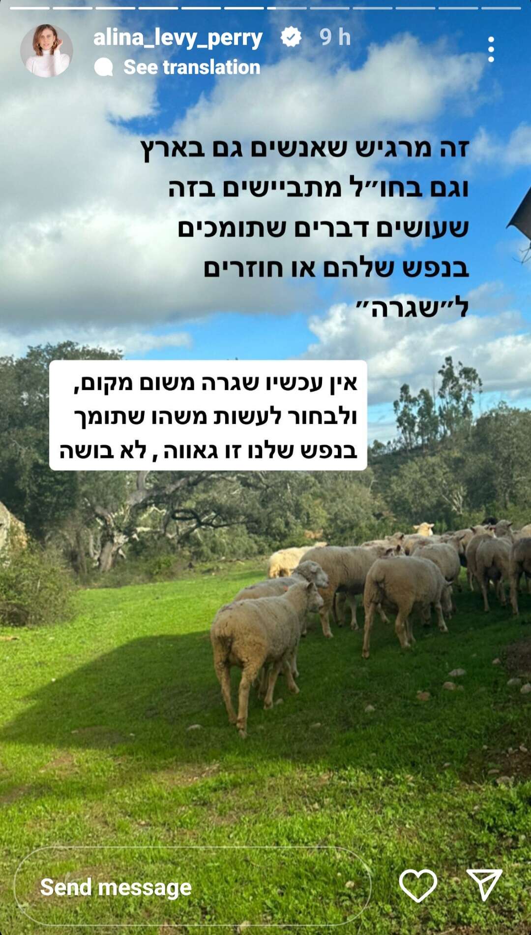 "זה מרגיש שאנשים גם בארץ וגם בחו״ל מתביישים בזה שעושים דברים שתומכים בנפש שלהם או חוזרים ל'שגרה', כתבה ואז הסבירה כי הבחירה שלה, גם אם לא כולם מסכימים איתה, אין בה שום בושה אם היא תומכת בנפש אלא בדיוק להיפך. "אין עכשיו שגרה משום מקום, ולבחור לעשות משהו שתומך בנפש שלנו זו גאווה, לא בושה", הדגישה אלינה כשהיא משתפת בתמונות נוף וטבע מהחווה בפורטוגל בה הם מתאכסנים.
