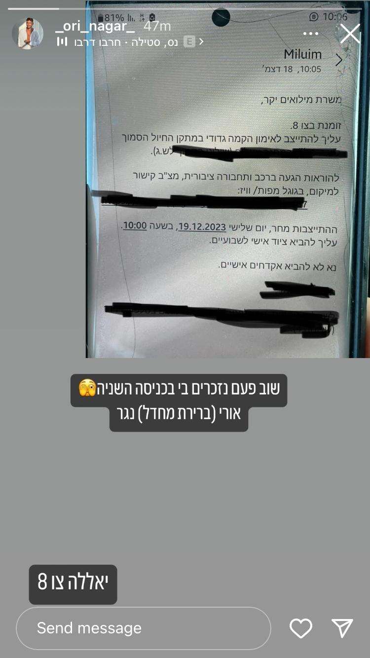 אורי נגר פרסם היום (שני) סטורי שבו עדכן את למעלה מ-90 אלף עוקביו על קבלת צו 8 לשירות מילואים. נגר, ששירת בעבר כלוחם קרבי בגבעתי, אמנם התייחס לעניין בקלילות ואפילו התבדח על כך בסטורי בחשבונו באינסטגרם, אבל בשיחה עמנו הוא נשמע מעט אחרת והביע חששות מהגיוס כשסיפר על שנים רבות שבהן לא התאמן. בשיחה פתוחה הוא שיתף גם ברצונו ששתי בנותיו יהיו גאות בו, והעביר מסר חשוב מבחינתו לאזרחים.