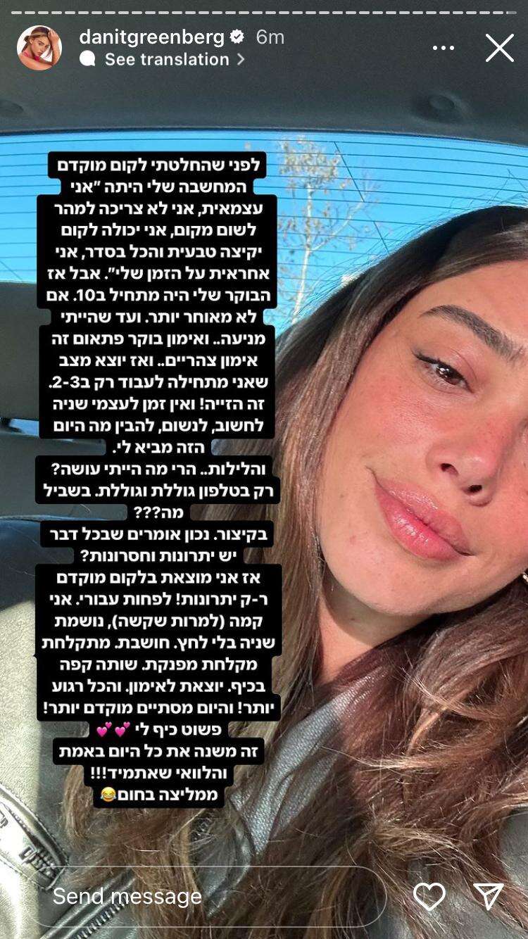 מי שעוקב אחרי עמוד האינסטגרם של דנית גרינברג בטח שם לב לכך שבימים האחרונים היא מעלה ומפרסמת את תכניה למאות אלפי העוקבים שלה כבר משעות הבוקר המוקדמות. היום (שלישי) היא התייחסה לשינוי הגדול שערכה בחייה, ומנתה בסטורי שפרסמה בחשבונה באינסטגרם את יתרונותיו הרבים מבחינתה. עוד לפני כן סיפרה על השגרה הלחוצה ובזבוז הזמן שהיו מנת חלקה עד שהגיעה למסקנה שעליה לחולל מהפך.