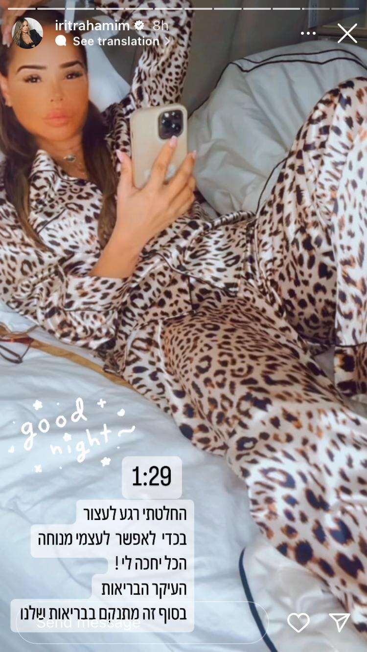 "1:29 – החלטתי רגע לעצור, בכדי לאפשר לעצמי מנוחה, הכל יחכה לי", כתבה רחמים כשברקע תמונה שלה בפיג'מה שוכבת על מיטתה ומחזיקה את הטלפון הנייד בידה. "העיקר הבריאות, בסוף זה מתנקם בבריאות שלנו", הוסיפה ובירכה ב"לילה טוב".