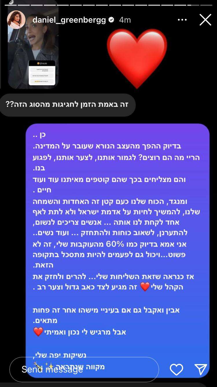 "זה באמת הזמן לחגיגות מהסוג הזה?", תהתה אחת הגולשות בתגובה לסטורי שבו גרינברג שאלה את העוקבות איזה סוג של מוזיקה היו רוצות לשמוע באירוע. "כן", השיבה דניאל. "בדיוק ההיפך מהעצב הנורא שעובר על המדינה. הרי מה הם רוצים? לגמור אותנו, לצער אותנו, לפגוע בנו. והם מצליחים בכך שהם קוטפים מאיתנו עוד ועוד חיים", הסבירה.