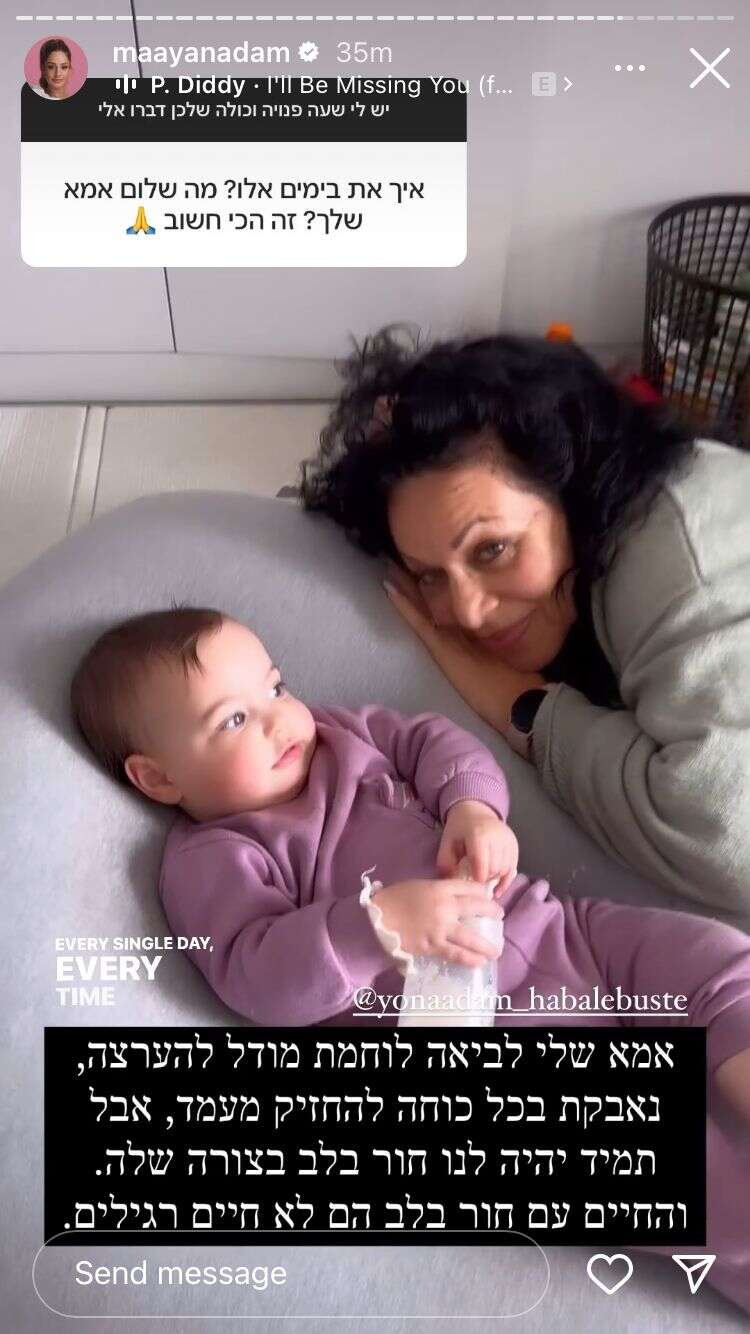 "איך את בימים אלו? מה שלום אימא שלך? זה הכי חשוב", ביקשה לדעת אחת הגולשת. "אימא שלי לביאה לוחמת, מודל להערצה, נאבקת בכל כוחה להחזיק מעמד, אבל תמיד יהיה לנו חור בלב בצורה שלה. והחיים עם חור בלב, הם לא חיים רגילים", הבהירה.