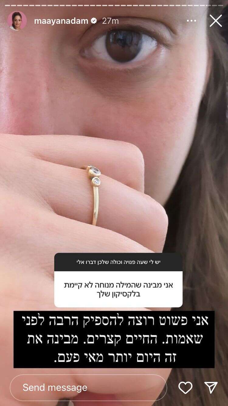 מעיין אדם הרימה היום (רביעי) את הכפפה ופצחה בסשן שאלות ותשובות עם מאות אלפי עוקביה באינסטגרם. בין שאלות פרטיות שעסקו במצב הרוח המשפחתי אחרי הטרגדיה המשפחתית שחוותה עם הירצחה של אחותה מפל אדם ז"ל בטבח 7 באוקטובר, ולידתה הצפויה של בתה השנייה, הייתה גם הערה שנזרקה לעבר מגישת הטלוויזיה בנוגע לתוכן הרב שהיא מעלה הקשור למיזם החדש שהקימה שמעניק הנחות והטבות לרכישת שלל מוצרים.
