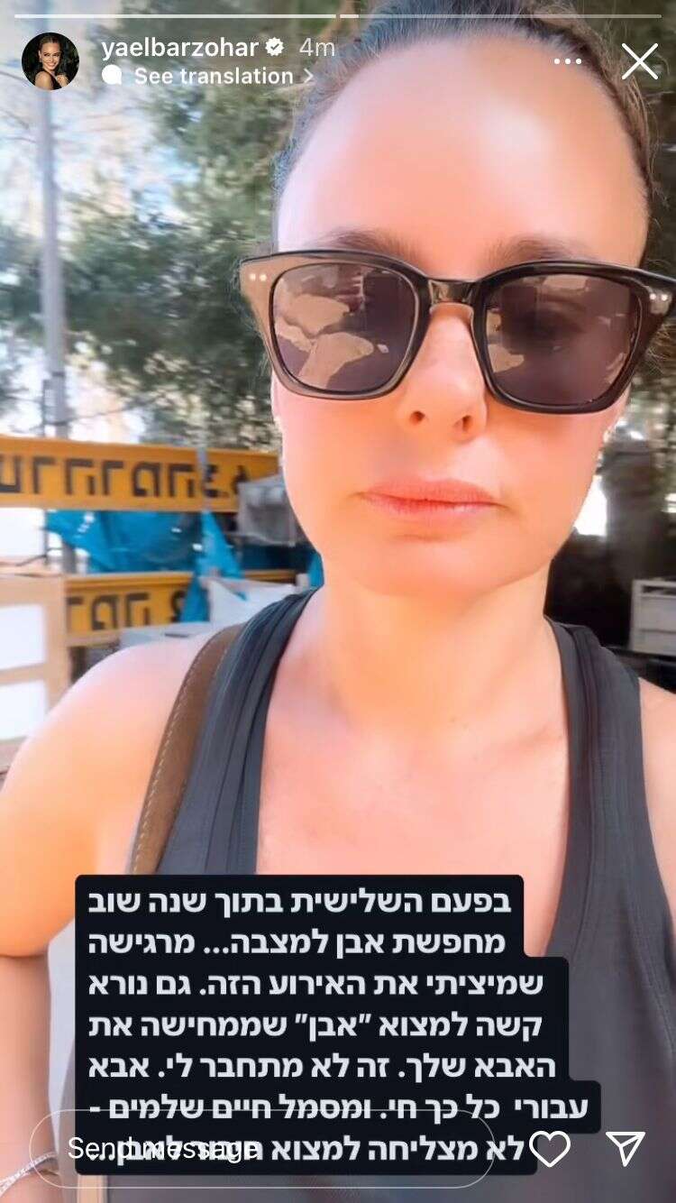 "בפעם השלישית בתוך שנה, שוב מחפשת אבן למצבה", כתבה בר זוהר על רקע סרטון שבו תיעדה את עצמה במהלך החיפוש. "מרגישה שמיציתי את האירוע הזה", הוסיפה כמי שרק לפני שמונה חודשים איבדה את אחיינו של בעלה עילי ברעם ז"ל, שנרצח כשבילה במסיבת הטבע בסמוך לקיבוץ רעים ב7 באוקטובר.