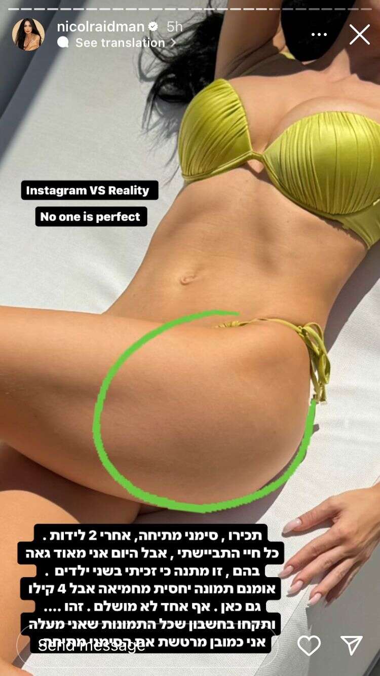"בנות אהובות, הסטורי הזה מוקדש לכולנו", אמרה ראידמן בפתח דבריה. "לכל אחת שחוששת להתפשט בחוף הים ויש לה איזושהי תסבוכת עם הגוף שלה, כמו שלי למשל יש. אני עליתי עכשיו ארבעה קילו ואני מרגישה עם עצמי לא טוב. אז כיוון שאנחנו ניזונות מהתמונות באינסטגרם, שרובן מרוטשות, גם אני מרטשת את התמונות שלי, אף אחד לא מושלם. גם לי יש צלוליט, גם לי יש סימני מתיחה מהלידות, זה בסדר".