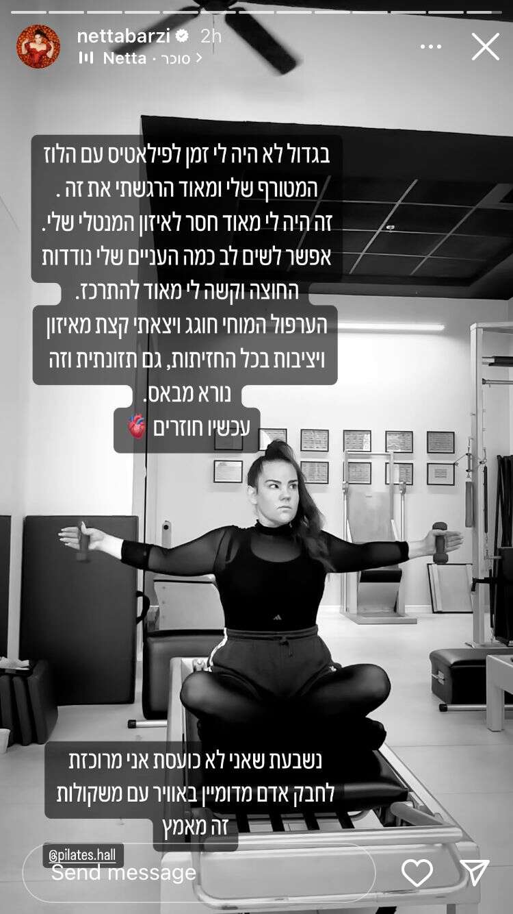"בגדול לא היה לי זמן לפילאטיס עם לוח הזמנים המטורף שלי, ומאוד הרגשתי את זה", כתבה ברזילי בפתח דבריה. "זה היה לי מאוד חסר לאיזון המנטלי שלי", הוסיפה.