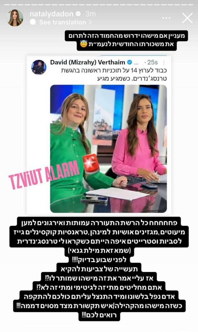 "כבוד לערוץ 14 על תוכנית ראשונה בהגשת טרנסג'נדרים, כשמגיע מגיע", כתב בסרקזם ורטהיים על רק תמונה של דדון באולפן הערוץ.