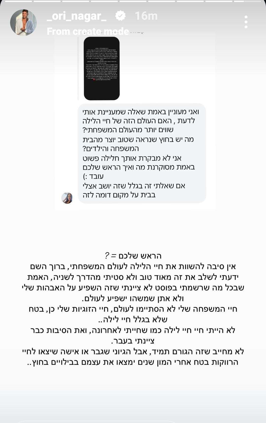 בהמשך, שיתף בתגובה שקיבל בפרטי מגולשת על הסטורי ועוררה מעט את זעמו. "שאלה שמעניינת אותי לדעת", כתבה לו העוקבת הסקרנית. האם העולם הזה של חיי הלילה שווה יותר מהעולם המשפחתי? מה יש בחוץ שנראה שטוב יותר מהבית המשפחה והילדים? אני לא מבקרת אותך חלילה, פשוט באמת מסוקרנת מה ואיך הראש שלכם עובד. אם שאלתי זה בגלל שזה יושב אצלי בבית על מקום דומה לזה".