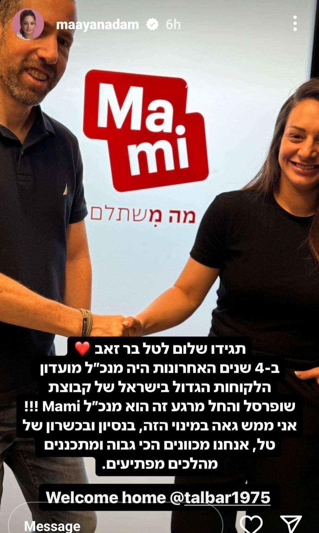 "תגידו שלום לטל בר זאב", כתבה אדם על גבי תמונה של השניים לוחצים ידיים. "בארבע השנים האחרונות הוא היה מנכ"ל מועדון הלקוחות הגדול בישראל של קבוצת שופרסל והחל מרגע זה הוא מנכ"ל Mami. אני ממש גאה במינוי הזה, בניסיון ובכישרון של טל. אנחנו מכוונים הכי גבוה ומתכננים מהלכים מפתיעים". בהמשך, ביקשה אדם לשמוע את דעתן של הנשים בקהל.
