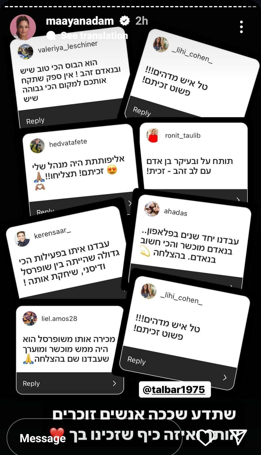 בכל הנוגע למינוי עצמו, אדם שיתפה עשרות צילומי מסך שהפליגו בשבחים למנכ"ל הנבחר. "טל איש מדהים, פשוט זכיתם", פרגנו העוקבות. "הוא הבוס הכי טוב שיש ובן אדם זהב. אין ספק שהוא יקח אתכם למקום הכי גבוה שיש".