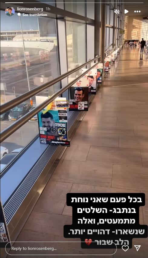 בסטורי שפרסם מנמל התעופה בן גוריון, שיתף רוזנברג תמונה מרגשת של שלטי החטופים המוצבים במעבר מטרמינל 3 לאזור השרוולים, וכתב בכאב: "בכל פעם שאני נוחת בנתב"ג, השלטים מתמעטים, ואלה שנשארים - דהויים יותר. הלב שבור".