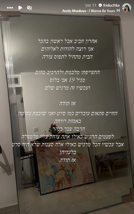 אמש (רביעי) אחרי עוד יום עמוס בסידורים ורכישת רהיטים, היא הציבה מראה גדולה בסלון והעלתה סטורי בו בחרה להודות לאלוהים על המסע הארוך שעברה וגם על הרגעים הקשים בחייה שהביאו אותה למקום בו היא נמצאת היום.