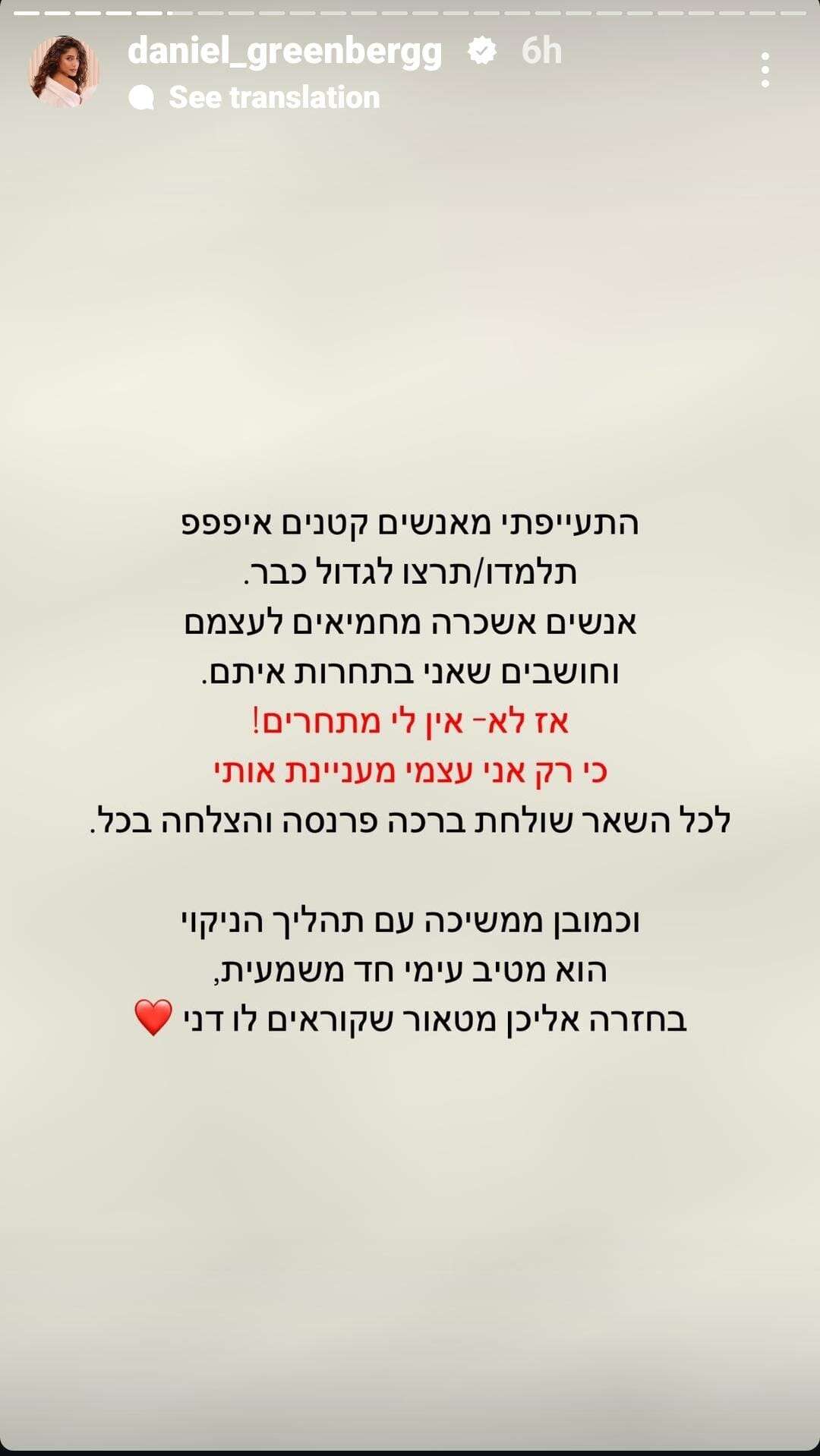 "לכל השאר שולחת ברכה פרנסה והצלחה בכל וכמובן ממשיכה עם תהליך הניקוי", כתבה כשהיא מתייחסת לעובדה שהחליטה להוציא מחייה את כל מי ומה שלא עושים לה טוב. "הוא מטיב עמי חד משמעית. בחזרה אליכן מטאור שקוראים לו דני".