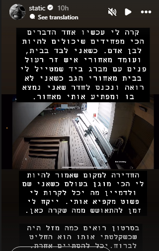 "קרה לי עכשיו אחד הדברים הכי מפחידים שיכולים להיות לבן אדם", שיתף סטטיק בחשבון האינסטגרם שלו. "כשאני לבד בבית, ועומד מאחורי איש זר רעול פנים עם מברג ביד, שמטייל לי בבית מאחורי הגב כשאני לא רואה ונכנס לחדר כשאני לא רואה, ונכנס לחדר שאני נמצא בו ומפתיע אותי מאחור".
