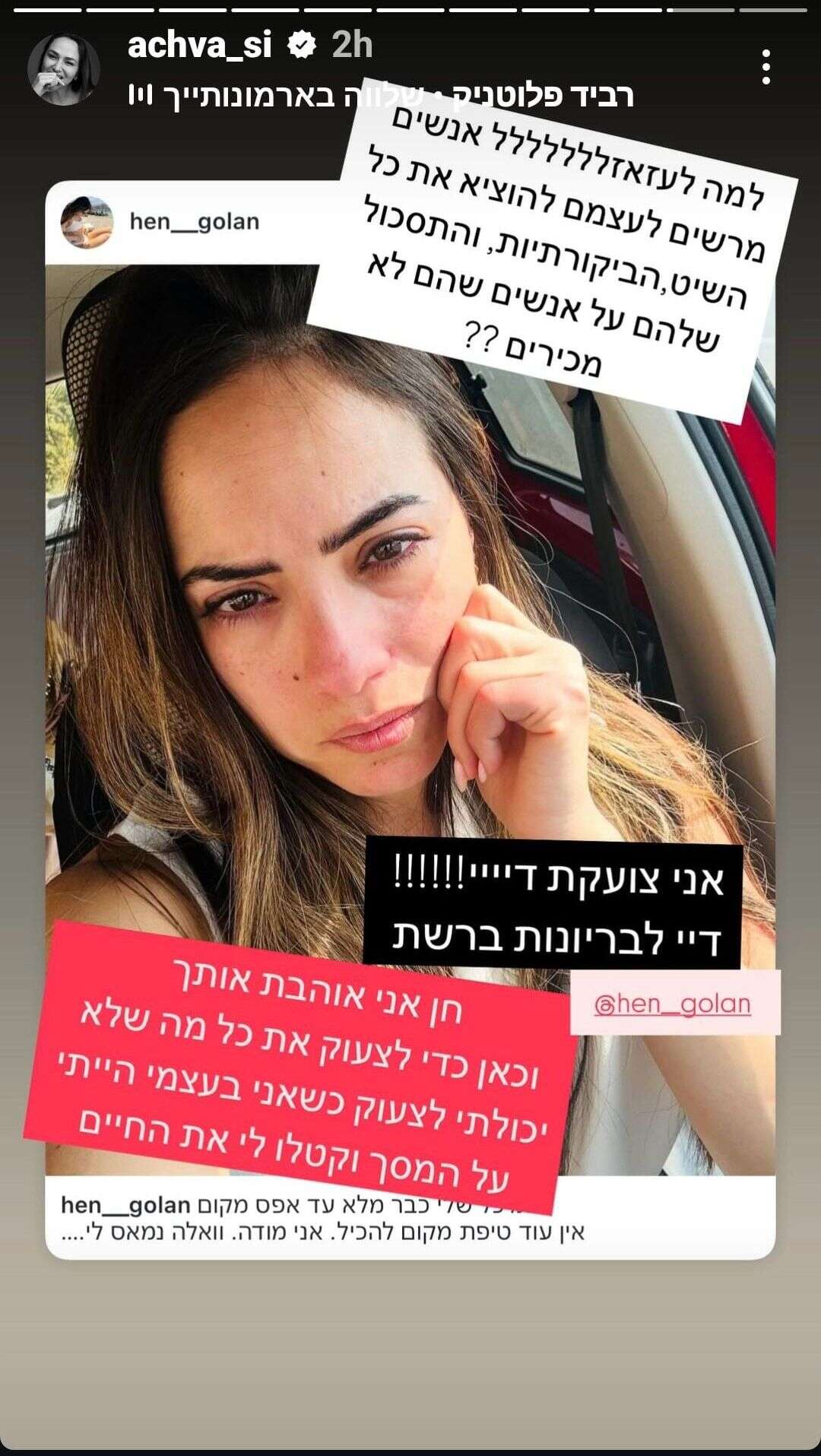גולן גם שיתפה בסיבה שהביאה אותה לכתוב את הפוסט הקשה והכואב: "המטרה של כל התגובות בהמשך, היא כדי לפרוק, כדי להוציא את זה מעצמי, כדי לשחרר את זה, והמטרה של התמונה זה כדי לבסס את הטענה שאני תמיד בוכה ועם אף אדום. אז אני לא יודעת באמת מה זה יעזור אבל גם לי כבר נשבר".
