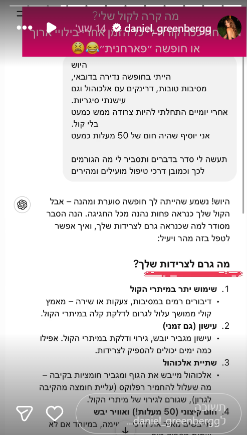 בסטורי שפרסמה לאחר נחיתתה כינתה את החוויה "חופשה פארחנית" והתלוננה על מצב מיתרי הקול שלה. גרינברג אף שיתפה את עוקביה בכך ששאלה את צ'אט GPT מה בדיוק גרם לצרידות שלה ומדוע אנשים נהיים צרודים אחרי בילויים.