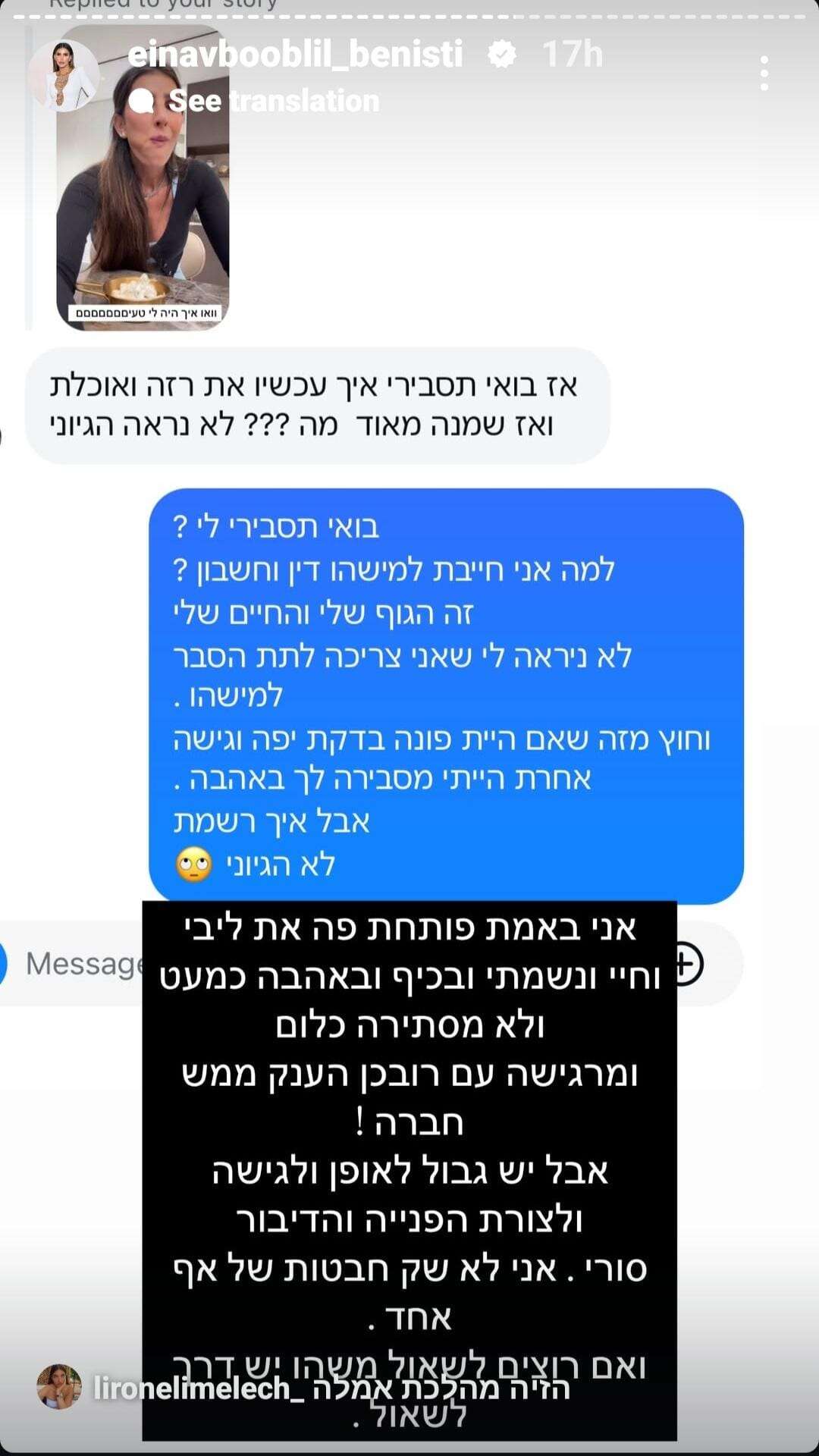 אחר כך, היא כתבה בסטורי שלה על רקע השיחה: "אני באמת פותחת פה את ליבי, חיי ונשמתי, ובכיף ובאהבה ולא מסתירה כלום, מרגישה עם רובכן הענק ממש חברה, אבל יש גבול לאופן ולגישה, ולצורת הפנייה והדיבור. סורי. אני לא שק חבטות של אף אחד. אם רוצים לשאול משהו יש דרך".