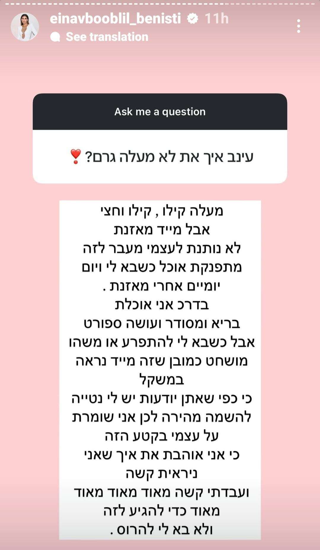 כשנשאלה על ידי עוקבת אחרת איך בכל זאת היא מצליחה לשמור על המשקל, עינב ענתה בכנות מבלי לייפות את המציאות: "מעלה קילו, קילו וחצי, אבל מיד מאזנת. לא נותנת לעצמי מעבר לזה, מתפנקת, אוכלת כשבא לי ויום יומיים אחרי מאזנת. בדרך כלל אני אוכלת בריא ומסודר ועושה ספורט, אבל כשבא לי להתפרע או משהו מושחת כמובן שזה מיד נראה במשקל כי כפי שאתן יודעות יש לי נטייה להשמנה מהירה. לכן אני שומרת על עצמי בקטע הזה כי אני אוהבת את איך שאני נראית. עבדתי קשה מאוד כדי להגיע לזה ולא בא לי להרוס".