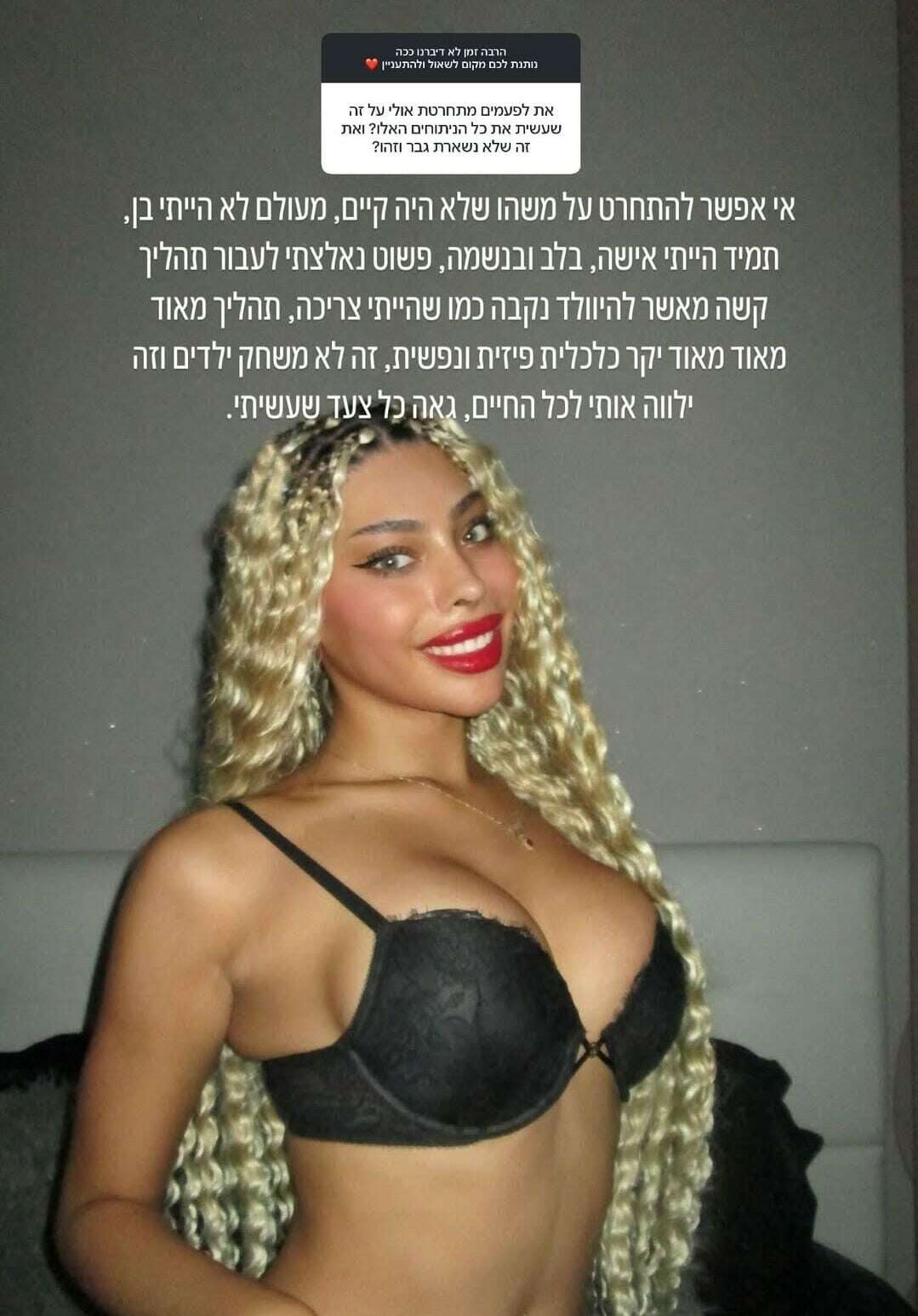 "אני מתעסקת אך ורק בחיים שלי, בפרנסה שלי ובבריאות שלי. לא נכנסת למוסרי לא מוסרי ולא מנרמלת שום דבר".