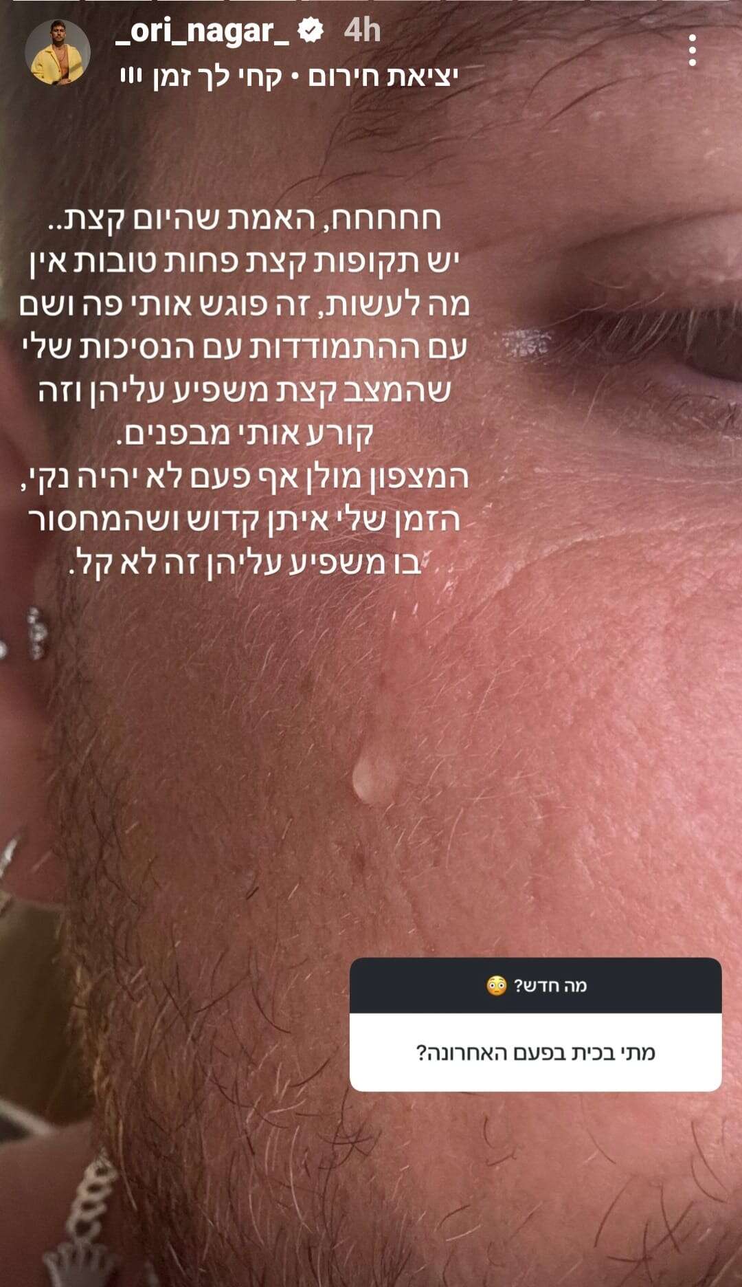 הסטורי הראשון ששיתף שמשך תשומת לב הגיע בדיוק מהמקום הכי חשוף כשנשאל על ידי עוקבת מתי הייתה הפעם האחרונה שבכה: "האמת שהיום קצת", התוודה אורי בטקסט שכתב על צילום מסך של הלחי שלו עם דמעה. "יש תקופות קצת פחות טובות, אין מה לעשות", הסביר. "זה פוגש אותי פה ושם עם ההתמודדות עם הנסיכות שלי שהמצב קצת משפיע עליהן וזה קורע אותי מבפנים. המצפון מולן אף פעם לא יהיה נקי. הזמן שלי איתן קדוש ושהמחסור בו משפיע עליהן זה לא קל", הוסיף ואמר.