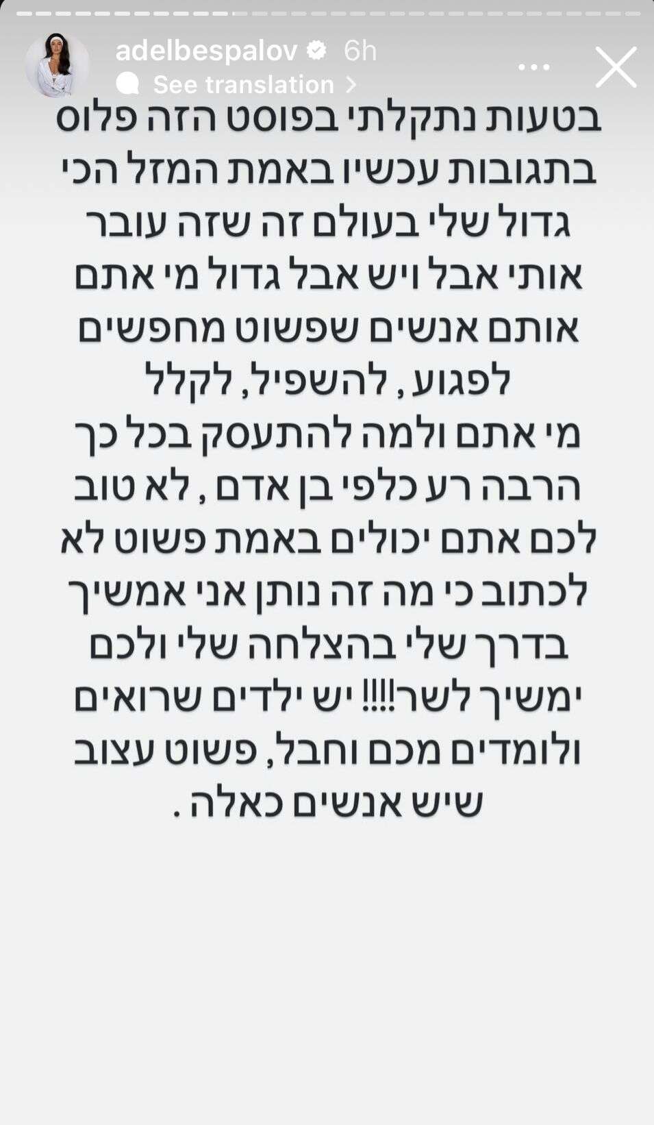 "בטעות נתקלתי בפוסט הזה פלוס בתגובות. עכשיו באמת המזל הכי גדול שלי בעולם זה שזה עובר אותי אבל ויש אבל גדול, מי אתם אותם אנשים שפשוט מחפשים לפגוע, להשפיל, לקלל, מי אתם ולמה להתעסק בכל כך הרבה רע כלפי בן אדם, לא טוב לכם? אתם יכולים באמת פשוט לא לכתוב כי מה זה נותן", כתבה אדל בסטורי.