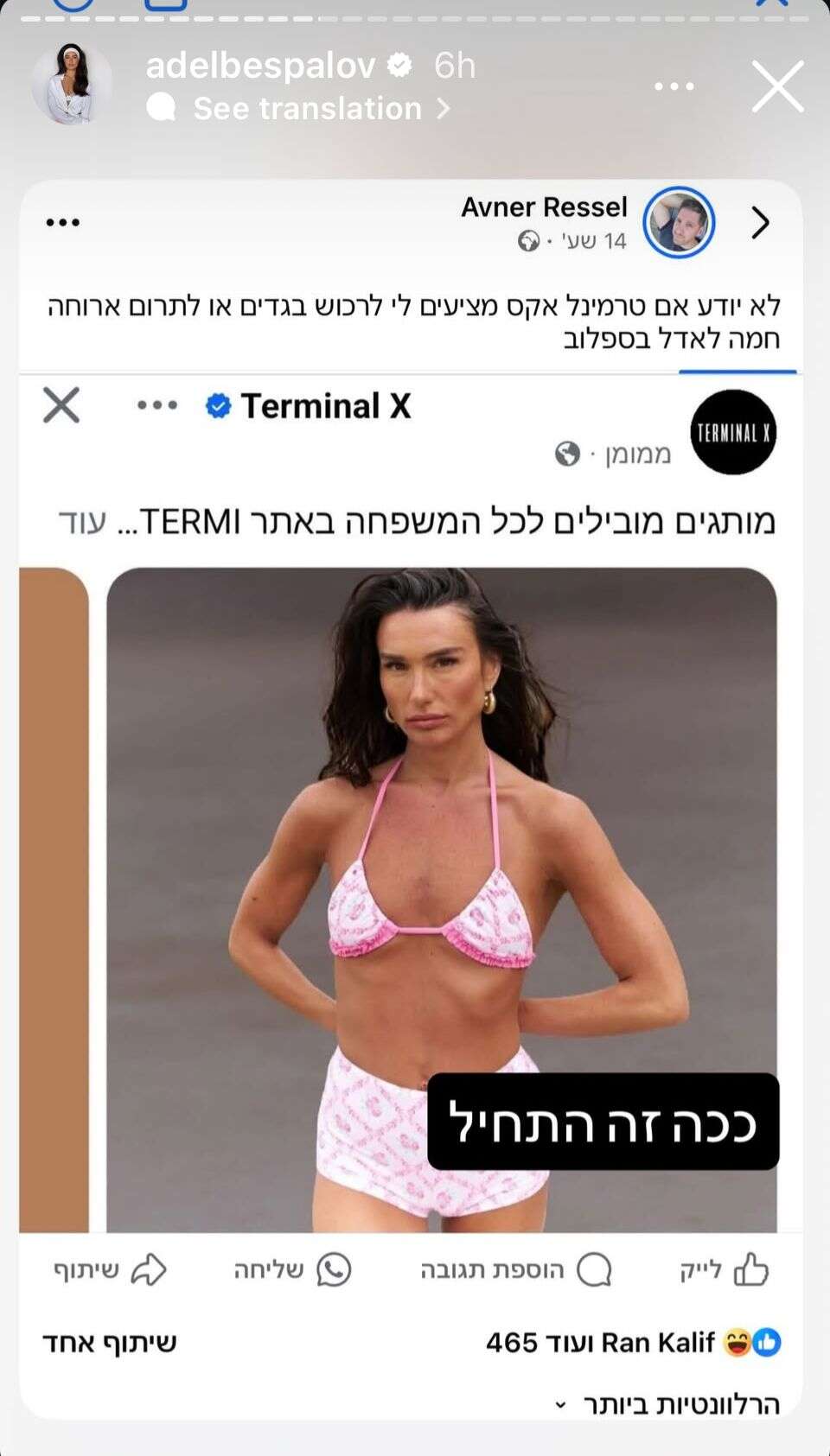 בסטורי שאחרי, צירפה בספלוב את פוסט הפייסבוק בו נתקלה, כשעל רקע תמונת הקמפיין שלה מטרמינל X, כתב אחד הגולשים: "לא יודע אם טרמינל אקס מציעים לי לרכוש בגדים או לתרום ארוחה חמה לאדל בספלוב". על רקע צילום מסך של הפוסט, כתבה בספלוב בסטורי: "ככה זה התחיל".