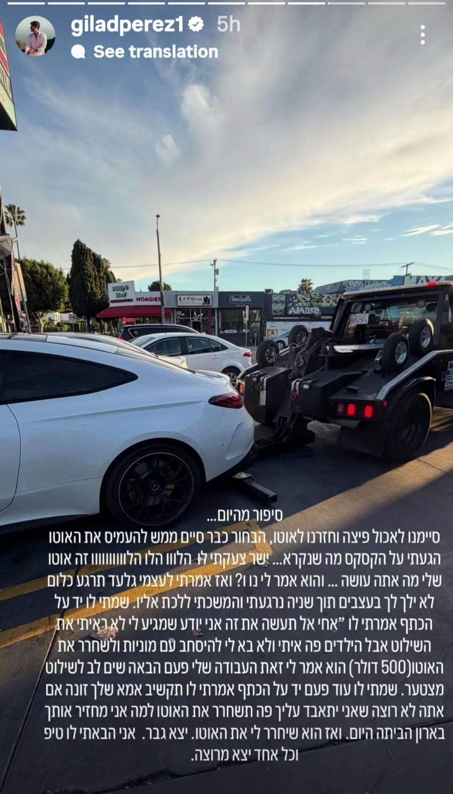"סיפור מהיום", פתח פרץ את הסטורי ששיתף היום (שני) עם 37.9 אלף עוקביו באינסטגרם כשהוא משתף בתמונת המכונית ורכב הגרר.