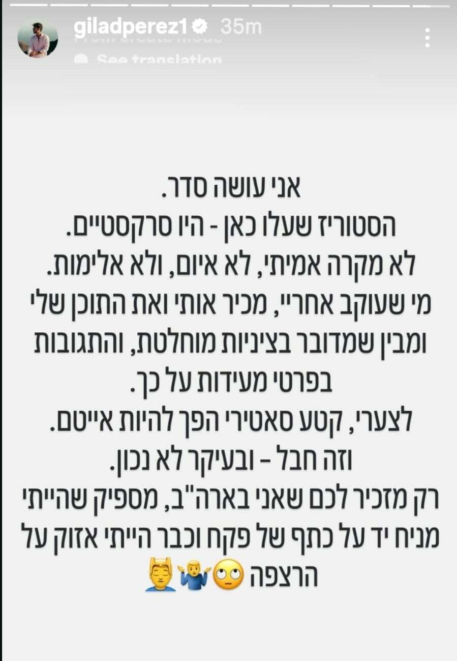"אני עושה סדר" - כתב והדגיש: "הסטוריז שעלו כאן היו סרקסטיים. לא מקרה אמיתי, לא איום ולא אלימות", כתב והוסיף שמי שעוקב אחריו ומכיר את הסגנון שלו היה צריך לזהות שהסטורי הקודם נכתב בציניות ואין בו אמת. "מי שעוקב אחריי מכיר אותי ואת התוכן שלי ומבין שמדובר בציניות מוחלטת והתגובות בפרטי מעידות על כך".