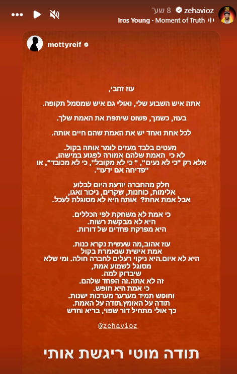 "עוז אהוב - מה שעשית נקרא כנות. אמת אישית שנאמרת בקול. היא לא איום. היא ניקוי רעלים לחברה חולה, ומי שלא מסוגל לשמוע אמת שיבדוק למה. זה לא אתה. זה הפחד שלהם. אמת היא חופש, וחופש תמיד מערער מערכות ישנות. תודה על האומץ. תודה על האמת. כך אולי מתחיל דור שפוי, בריא וחדש".