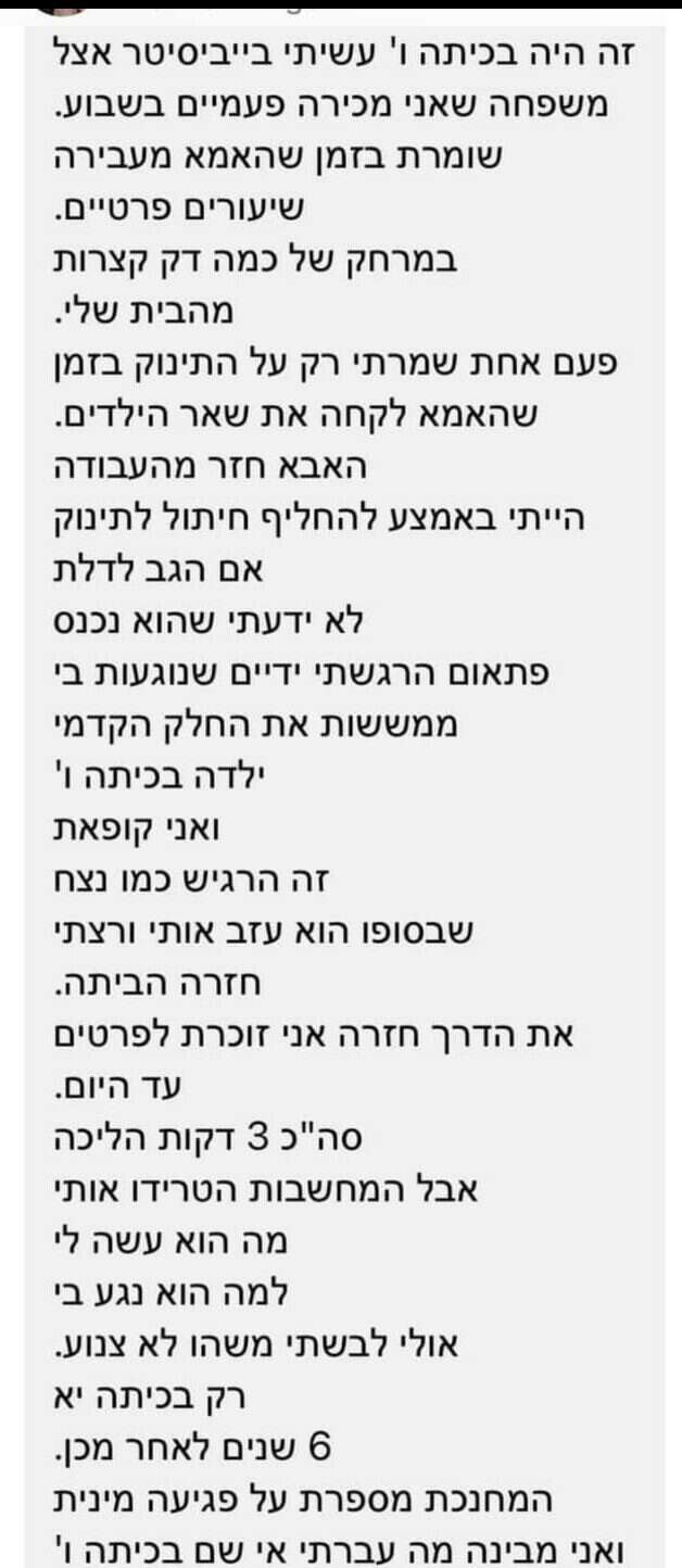 "אני הותקפתי והוטרדתי מינית בצורה הכי קשה ובוטה שיש כשהייתי בת 17, על ידי האב של הילדים שעליהם שמרתי, חבר קרוב מאוד של המשפחה. זה לא היה לי פשוט בכלל. לחתונה שלי הוא הגיע, ולחש לי שיש דברים שלא מספרים לבעל. כיום אני בת 28. ההורים שלי לא יודעים דבר על מה שקרה", כתבה אחת המגיבות בפרטי לויטלזון יעקבס.