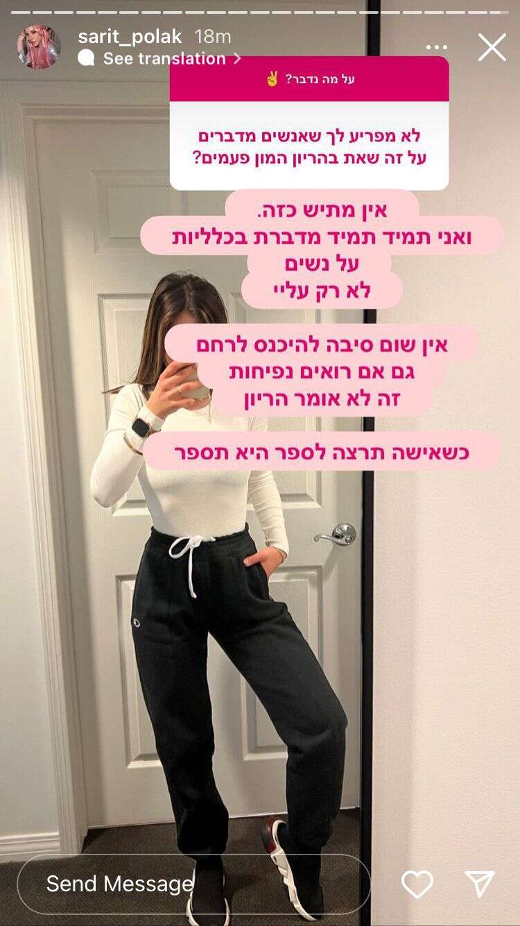 "על מה נדבר?", תהתה שרית פולק במה שפתח סשן שאלות ותשובות שקיימה אמש (שבת) באינסטגרם עם 109 אלף עוקביה, במהלכו התייחסה כאמור לנושא החדירה לפרטיותה בשאלות הנכנסות לה לרחם לדבריה, ונוגעות בעניין פרטי ואינטימי. בנוסף לכך, ובאווירה אחרת לגמרי, שיתפה פולק בחלומותיה ובמטרותיה לעתיד, וחשפה את האישיו הגדול שהיה לה בעבר עם הגובה שלה.