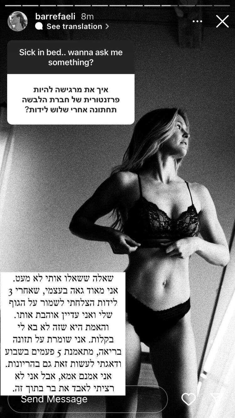 "אני אמנם אמא, אבל אני לא רציתי לאבד את בר בתוך זה", כתבה לבסוף כשהיא רומזת למצב שבו נשים רבות מזניחות את עצמן וגופן אחרי לידה, ומקדישות את כל תשומת הלב והאנרגיות שלהן לטיפול בעולל החדש.
