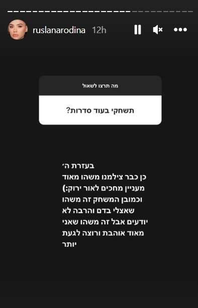 רודינה נשאלה גם על קריירת המשחק שפתחה בה בשנים האחרונות, וסיפרה כי הדבר בוער בתוכה. "תשחקי בעוד סדרות?", הסתקרנו העוקבים. "בעזרת השם כן. כבר צילמנו משהו מעניין, מחכים לאור ירוק", עדכנה. "כמובן שמשחק זה משהו שאצלי בדם, והרבה לא יודעים, אבל זה משהו שאני מאוד אוהבת ורוצה לגעת בתחום הזה יותר".