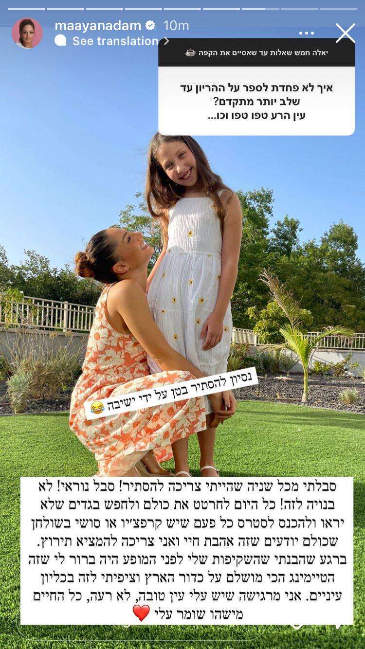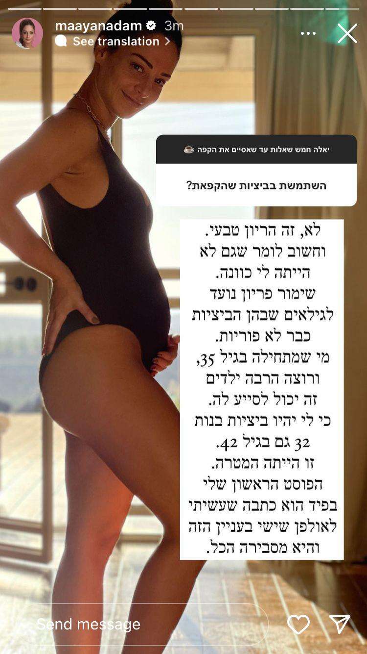 "איך לא פחדת לספר על ההיריון עד שלב יותר מתקדם?", ביקשה אחת העוקבות לדעת. "סבלתי מכל שנייה שהייתי צריכה להסתיר, סבל נוראי!", חלקה בתחושותיה. "כל היום לחרטט את כולם ולחפש בגדים שלא יראו ולהיכנס ללחץ כל פעם שיש קרפצ'יו או סושי על השולחן, כשכולם יודעים שזו אהבת חיי ואני צריכה להמציא תירוץ", המשיכה לפרט את הקשיים שבהם נתקלה. "ברגע שהבנתי שבדיקת השקיפות שלי לפני המופע, היה ברור לי שזה הטיימינג הכי מושלם על כדור הארץ. ציפיתי לזה בכיליון עיניים".