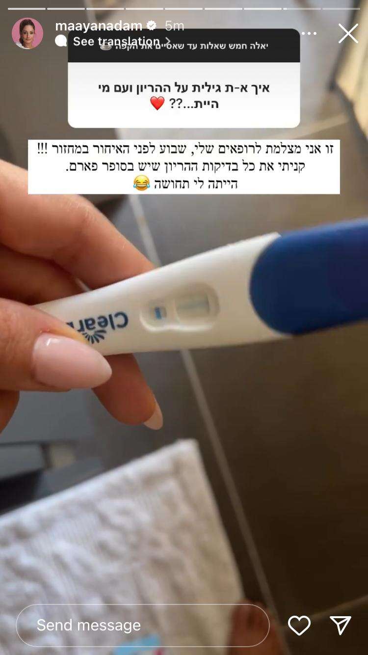 "איך גילית על ההיריון, עם מי היית?", הוסיפו המגיבות לדרוש בפרטים. "זו אני מצלמת לרופאים שלי, שבוע לפני האיחור במחזור", שיתפה את העוקבים בתמונה. "קניתי את כל בדיקות ההיריון שיש, הייתה לי תחושה", סיפרה.