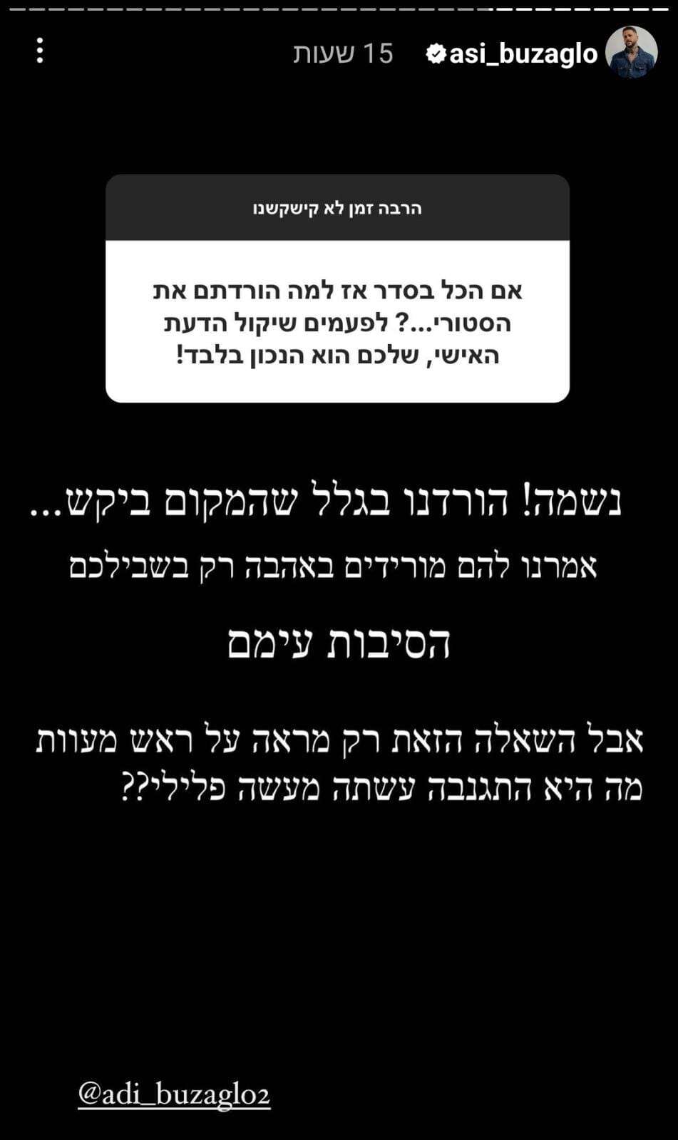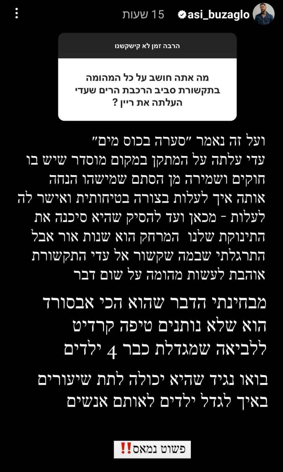 כוכב "הבוזגלוס" מתייצב לצד משפחתו: אשתו של אסי בוזגלו העלתה סטורי תמים בסוף השבוע האחרון לאינסטגרם, ונמצאת מאז במרכזה של סערה, כשהגולשים תוקפים אותה על הדרך שבה התנהלה עם בתה התינוקת, ריין. בוזגלו לא נשאר לצפות מהצד, ואתמול (רביעי) יצא להגנתה: "היא לא הפרה שום חוק, תנו לה קצת קרדיט", כתב.