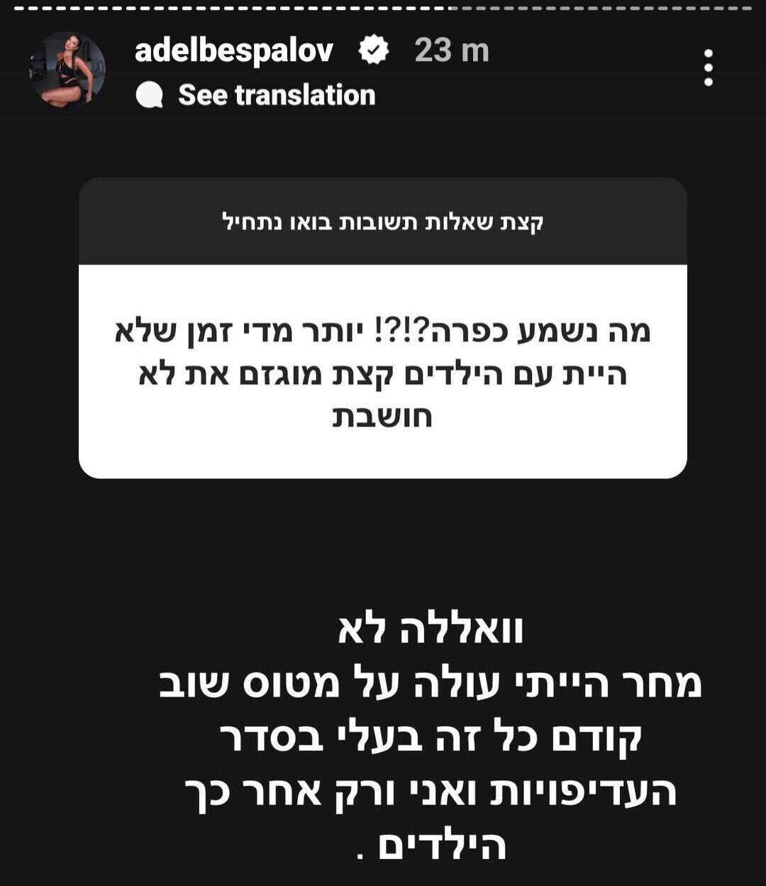 "מה נשמע כפרה?", כתבה לה עוקבת ואז מיהרה לעקוץ: "יותר מדי זמן שלא היית עם הילדים. קצת מוגזם את לא חושבת?". "וואלה לא", השיבה ללא היסוס בספלוב ששבה לאחרונה מחופשה מפנקת ואז הוסיפה: "מחר הייתי עולה על מטוס שוב. קודם כל זה בעלי בסדר העדיפויות ואני ורק אחר כך הילדים", חשפה בספלוב את המוטו שלה לחיים מאושרים, שיש לשער שהביא להצפה של תגובות ביקורתיות שקיבלה בפרטי.