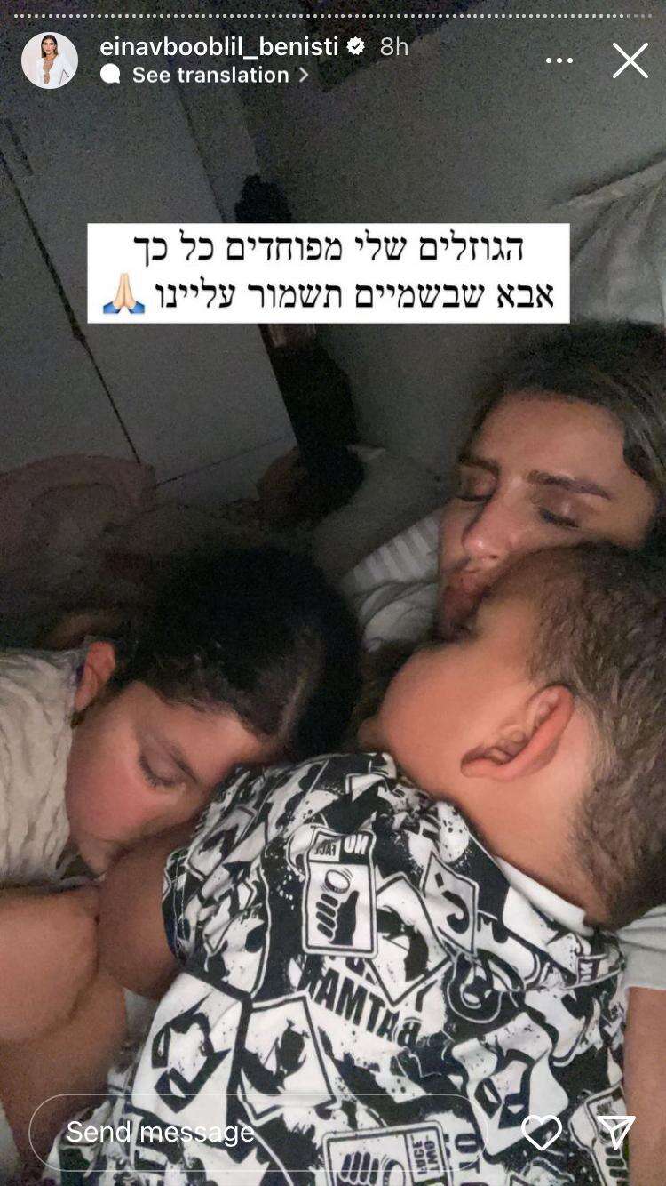בסטורי נוסף שהעלתה עינב היא תיעדה את עצמה במיטה, מחובקת על ידי שניים מילדיה. "הגוזלים שלי מפוחדים כל כך. אבא שבשמיים, תשמור עלינו", התפללה.