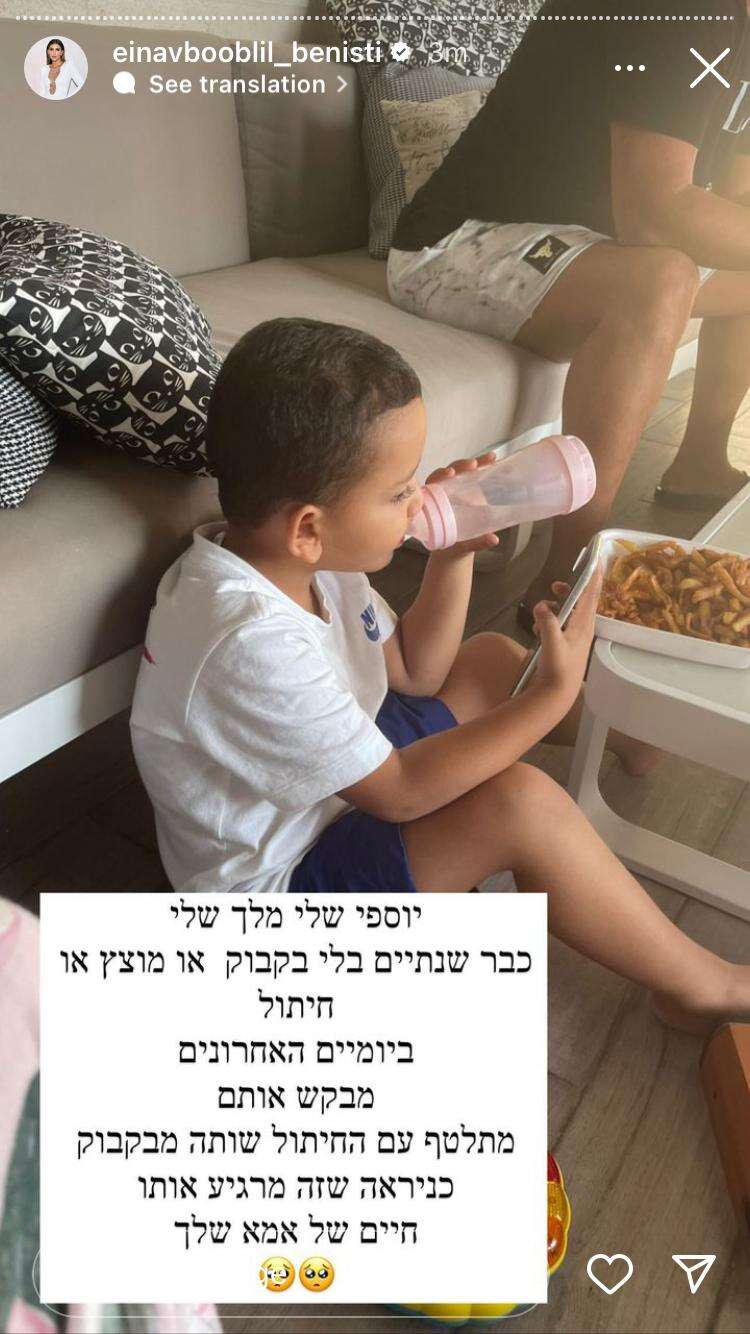 "יוספי שלי, מלך שלי, כבר שנתיים בלי בקבוק או מוצץ או חיתול. ביומיים האחרונים מבקש אותם. מתלטף עם החיתול, שותה מבקבוק, כנראה שזה מרגיע אותו. חיים של אימא שלך", כתבה בובליל על רקע תמונה ביתית של יוסף שותה מים מבקבוק תינוקות.