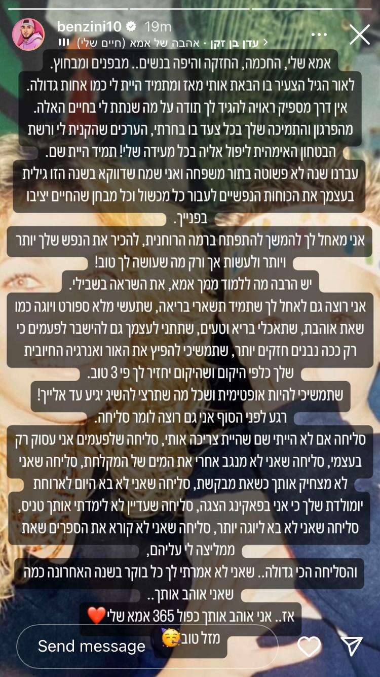 בן זיני עצר היום (רביעי) הכל והקדיש סדרת סטוריז בחשבונו הפופולרי ברשת החברתית אינסטגרם עבור האישה שהעניקה לו חיים עינב זיני. בסטורי ארוך במיוחד שבו הרעיף על אמו המון אהבה וחום הוא סיפר על החשיבות שלה בחייו ועל הביטחון שנסכה בו לאורך כל הדרך, גם בימים שבהם לא נחל הצלחה. לסיום ריגש במיוחד כשמנה את כל אותן הפעמים שבהן לא היה שם עבורה כפי שרצתה או ציפתה ממנו. ועל מה הוא הכי מתחרט?