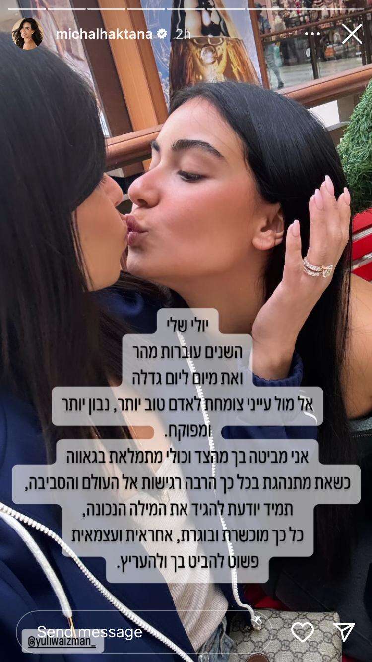 שעות לאחר מכן, המשיכה האם לברך את הבת. "יולי שלי, אהובתי, מעולם לא לימדו אותי איך להיות אימא טובה, מה צריך לעשות, מה להגיד ואיך, אבל שתדעי שאת גורמת לי להרגיש בכל יום שאני פשוט עושה את הדבר הנכון. אני מאושרת שאת יודעת בדיוק מה טוב לך, שאת עומדת על שלך וצועדת בדרכך. אני מאושרת כשאת באה אליי עם עוד רעיון או שאיפה ואני באמת מקווה שתמיד תמצאי לנכון לבוא אליי למיטה, להתכרבל, לשאול ולספר לי איך עבר עלייך היום והאתמול. אני שלך, בכל מצב ובכל זמן", הבטיחה. "השנים עוברות מהר, ואת מיום ליום גדלה אל מול עיניי, צומחת לאדם טוב יותר, נבון יותר, ומפוקח. אני מבטיח בך מהצד ומתמלאת גאווה. כל כך מוכשרת, בוגרת, אחראית ועצמאית".