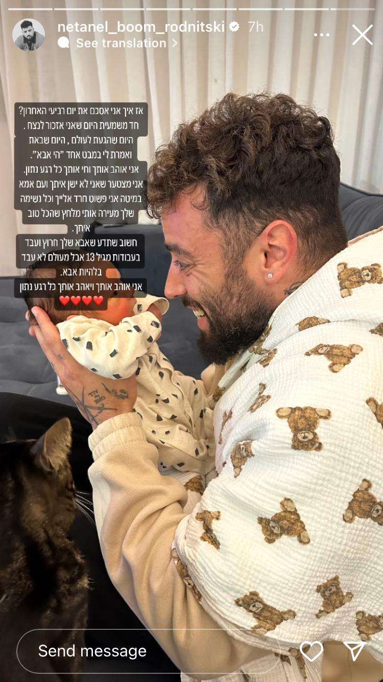 "אז איך אני אסכם את יום רביעי האחרון?", שאל רודניצקי ומיד השיב. "חד משמעית היום שאני אזכור לנצח. היום שהגעת לעולם, היום שבאת ואמרת לי במבט אחד 'היי, אבא'. אני אוהב אותך וחי אותך כל רגע נתון", כתב לבנו.