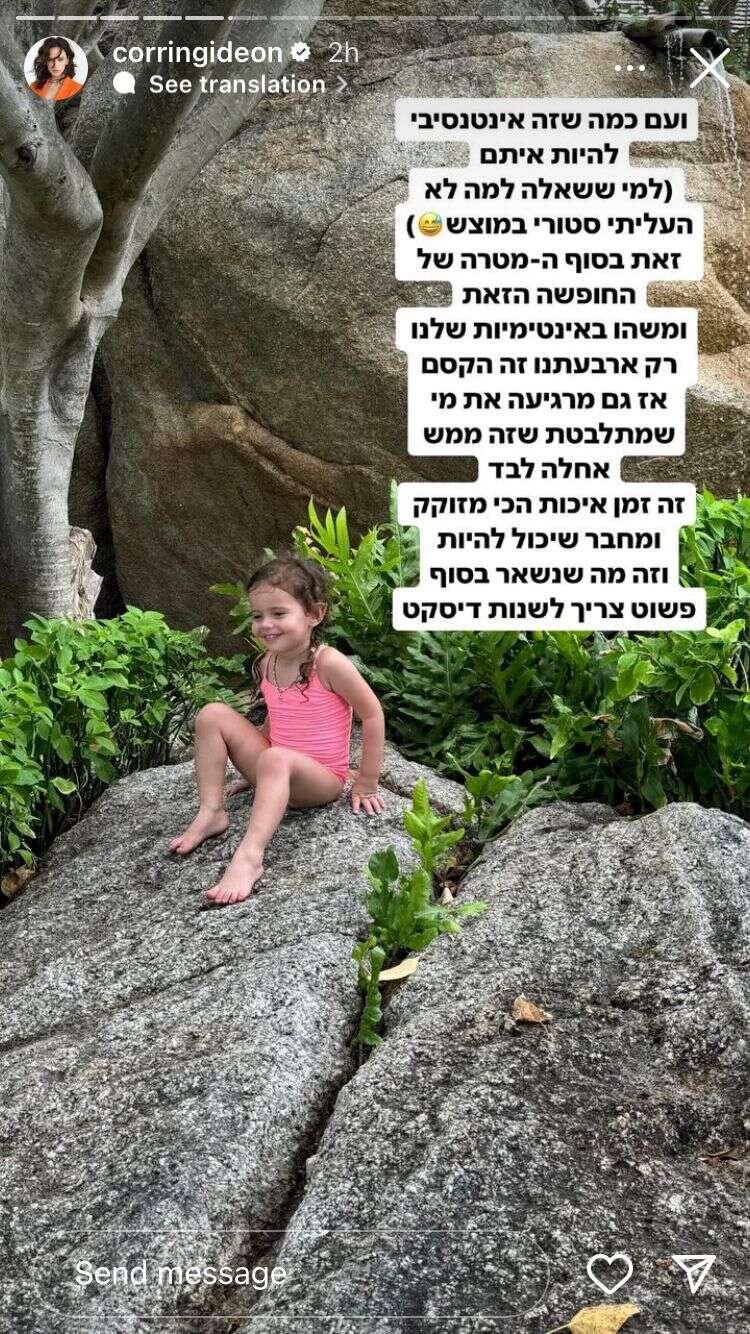 בסטורי אחר פירטה מדוע החליטה לוותר על שירות המטפלת. "עם כמה שזה אינטנסיבי להיות איתם (למי ששאלה למה לא העליתי סטורי במוצ"ש) זאת בסוף המטרה של החופשה הזאת", הזכירה לעצמה. "משהו באינטימיות שלנו, רק ארבעתנו, זה הקסם. אז גם מרגיעה את מי שמתלבטת שזה ממש אחלה לבד. זה זמן האיכות הכי מזוקק ומחבר שיכול להיות, וזה מה שנשאר בסוף. פשוט צריך לשנות דיסקט", ייעצה.