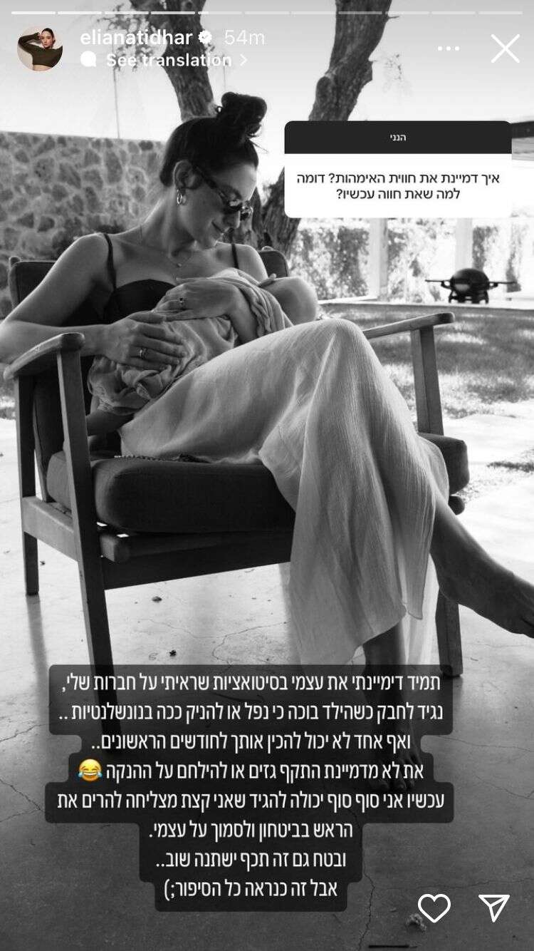 "איך דמיינת את חווית האימהות? דומה למה שאת חווה עכשיו?", ביקשו לדעת. "תמיד דמיינתי את עצמי בסיטואציות שראיתי על חברות שלי. נגיד לחבק כשהילד בוכה כי נפל או להניק ככה בנונשלנטיות. ואף אחד לא יכול להכין אותך לחודשים הראשונים. את לא מדמיינת התקף גזים או להילחם על ההנקה. עכשיו, אני סוף סוף יכולה להגיד שאני קצת מצליחה להרים את הראש בביטחון ולסמוך על עצמי. ובטח גם זה תכף ישתנה שוב, אבל זה כנראה כל הסיפור".