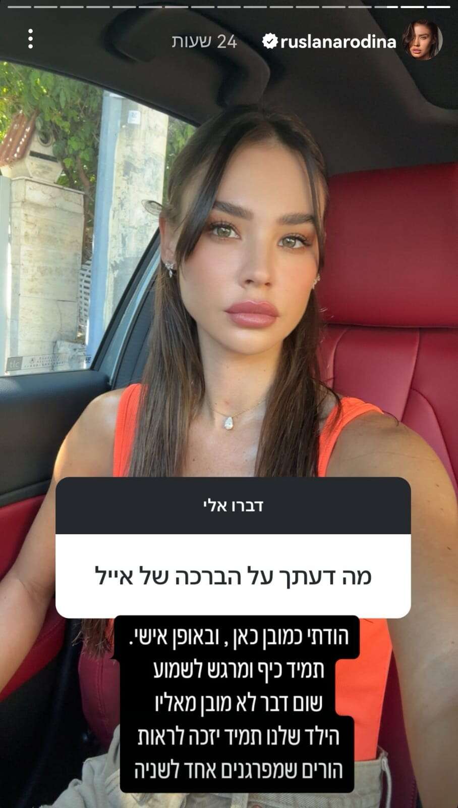 רודינה, מצידה, נשאלה בחשבון האינסטגרם שלה מה דעתה על הברכה של גולן והיא השיבה כי "הילד שלנו תמיד יזכה לראות הורים שמפרגנים אחד לשנייה". מי שרוצה לקרוא בין השורות יכול להבין כי רודינה מצטיירת כהפך הגמור מגרינברג.